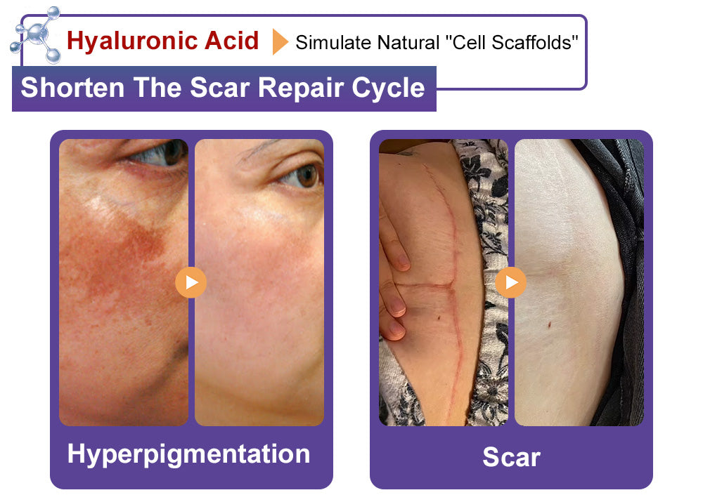 ✅ Hialuronsav – Mint a „természetes vízmágnes”, mindössze 1 gramm 1000 milliliter nedvességet képes megkötni. A bőr regenerálódása során a hialuronsav imitálja a természetes „sejtrácsot”, hidratált környezetet biztosítva, amely támogatja a fibroblaszt aktivitását és a kollagéntermelést. Ez felgyorsítja a szövetek regenerálódását és lerövidíti a hegek gyógyulási folyamatát. Több bőrregenerációval kapcsolatos tanulmány megerősítette, hogy hialuronsav jelenlétében a kollagéntermelés 62%-kal nő, a hegek keménysége 41%-kal csökken, és a pigmentáció akár 58%-kal is csökken. Kulcsfontosságú összetevő a műtéti és aknés hegek kezelésében.