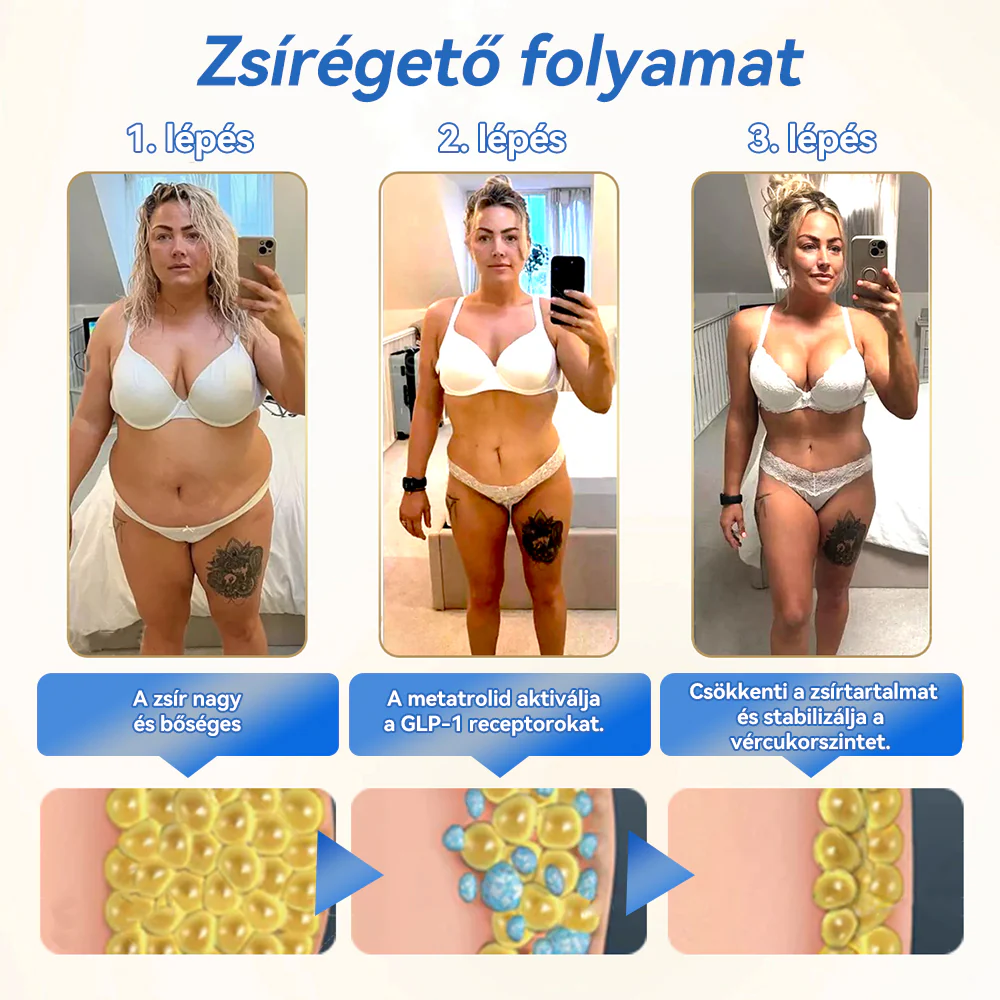 A Meglutid almaecettel és Moringa kivonattal kombinálva segíti a szervezetet, hogy hatékonyabban használja fel a zsírtartalékokat energiatermelésre. Az inzulinérzékenység javításával felgyorsítja a zsírégetést, különösen kalóriacsökkentés vagy fokozott fizikai aktivitás során. Az almaecet stabilizálja a vércukorszintet, megelőzve a glükóz zsírrá alakulását.