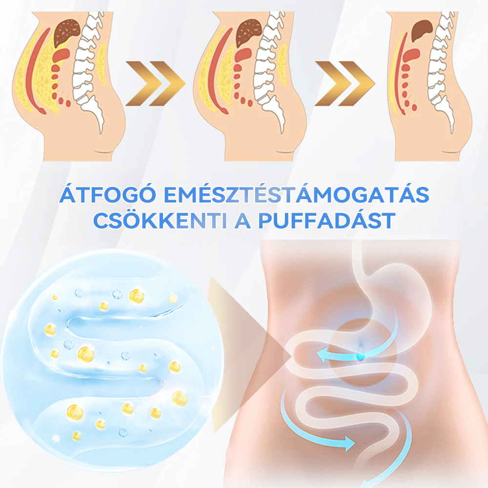 Zöld tea kivonat:Természetes növényi szer, amely serkenti a gyomorsav és emésztőnedvek termelését, javítva az emésztést és csökkentve a kellemetlenségeket. Emellett gátolja a zsírsejtek képződését a nyirokrendszeren keresztül, megelőzve a zsír felhalmozódását és súlygyarapodást.
